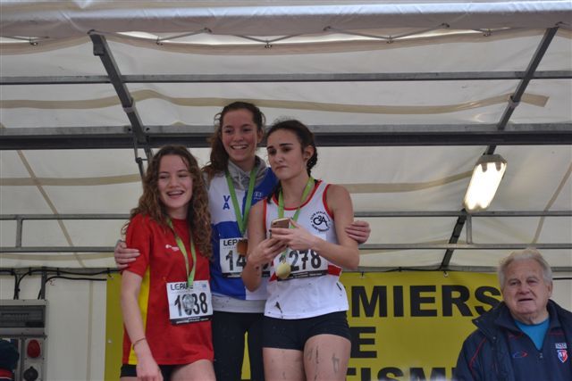 Minimes Filles : en tête de course dès le début, Clara Pavlovic eut cependant quelques difficultés à tenir le rythme imposé par les deux gagnantes du cross ouest de Louvres, et termine finalement à la 3ème place. Belle médaille de bronze donc pour Clara qui réalise la même performance que la saison passée. Jolie course également de Laetitia Grare, qui termine tout juste à la moitié de la course, à la 88ème position.